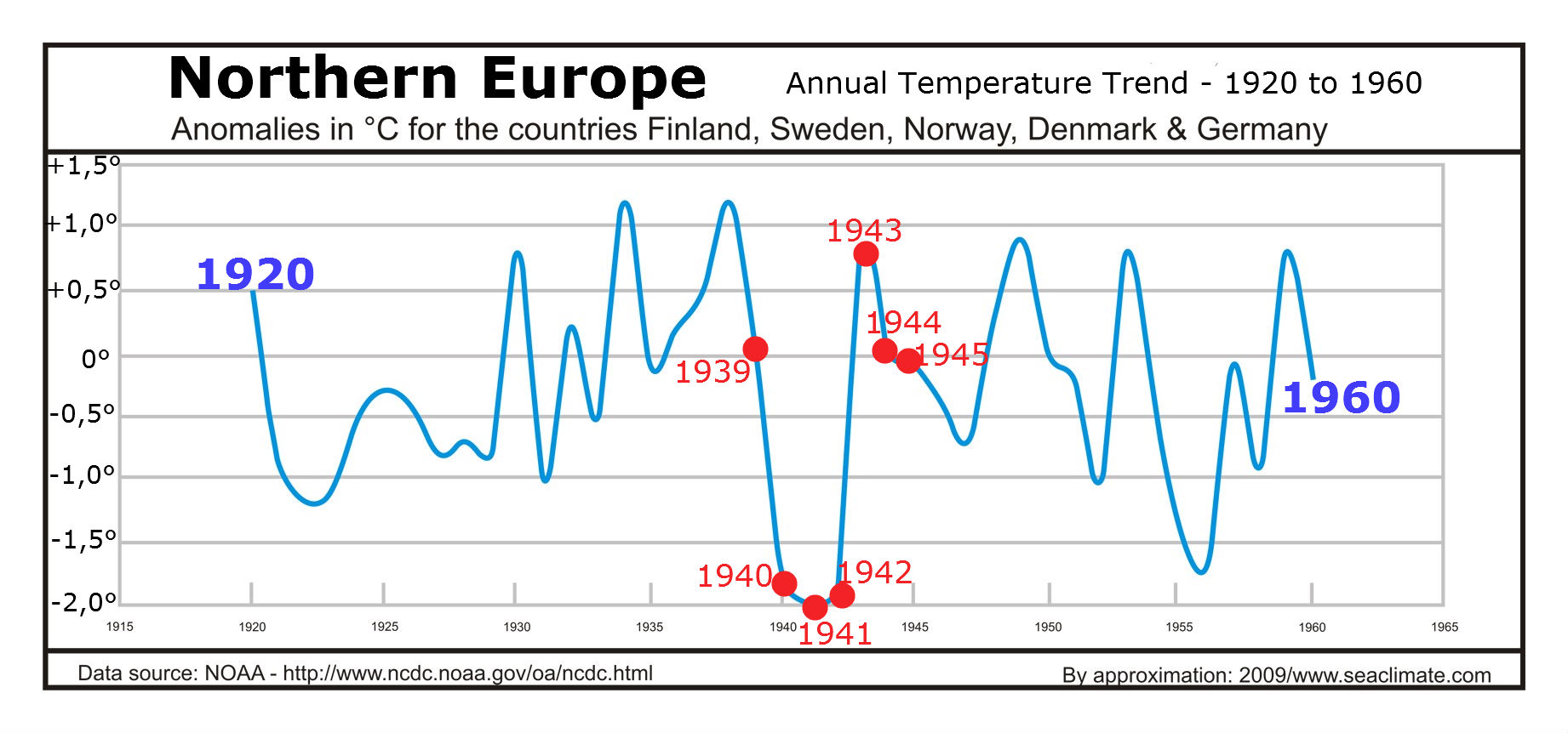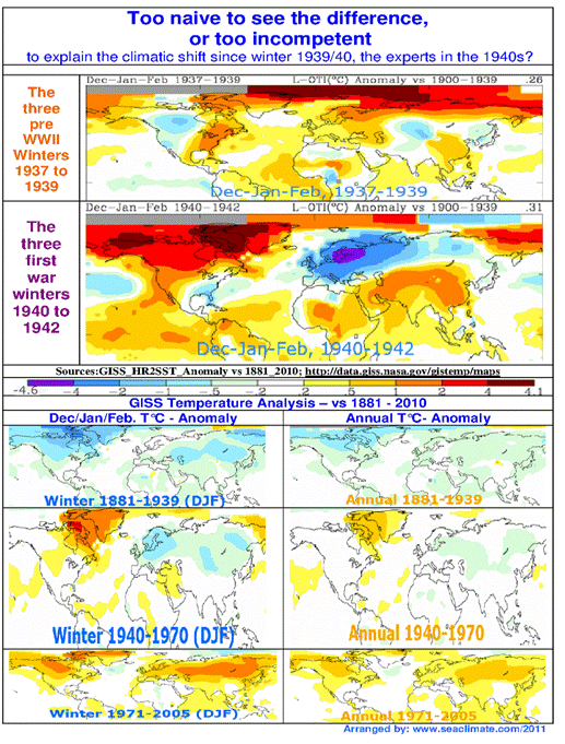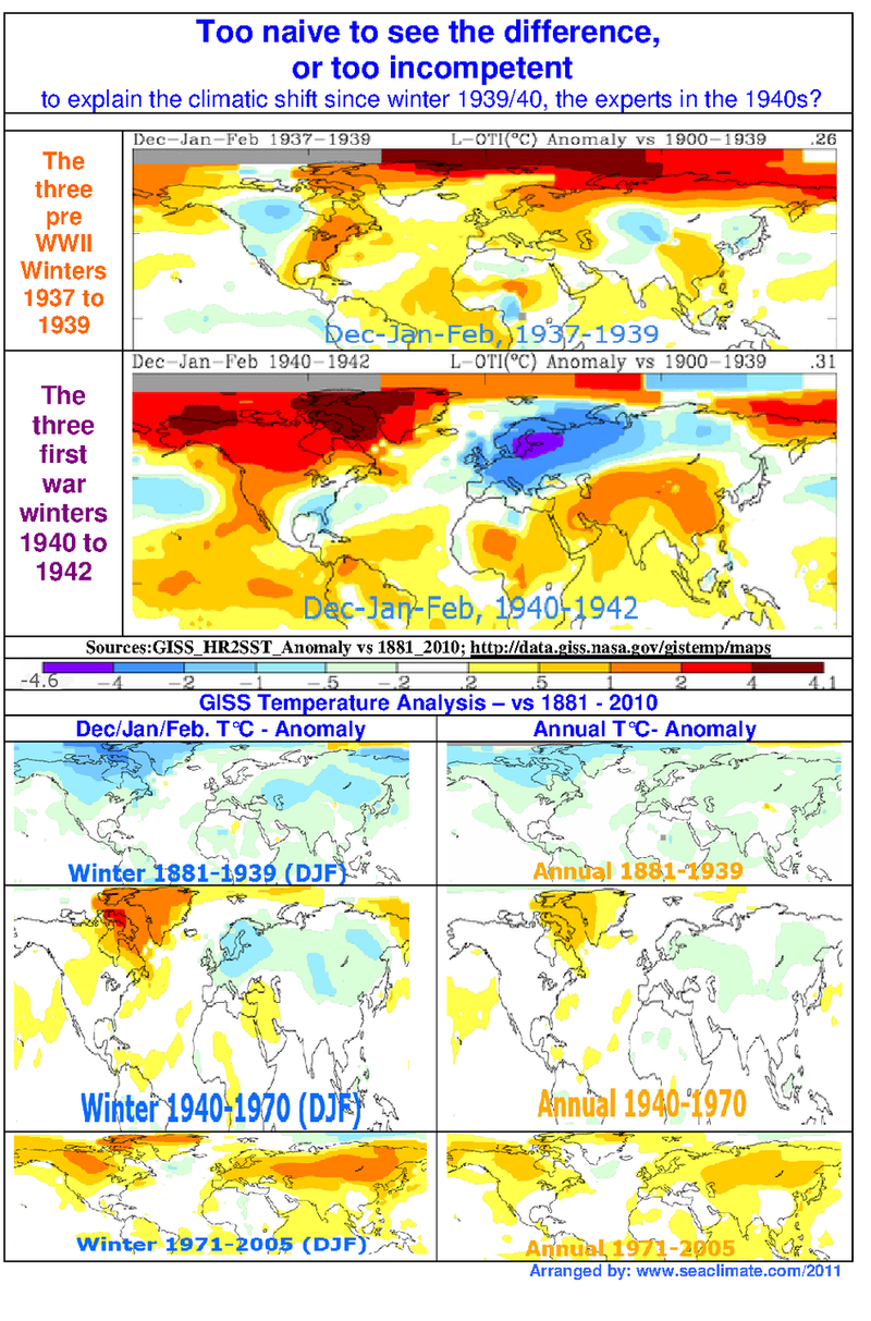 The thematic restriction to two very short periods - as already explained – is not the best solution, but it is sufficient enough to prove a direct influence of humans on weather. The numerous events portrayed in this work show that the oceans 'make the weather'. The two naval wars, 1914-1918 and 1939-1945, stand for a massive intervention in the marine environment. If one ignores the madness of these events, it is useful to regard the naval warfare as a large scale field experiment concerning weather and climate. At the end of WWI an increase of warming started in the Atlantic section of the Arctic for two decades. With WWII a global cooling commenced in Europe that lasted for three decades. However, the field experiment proves to be most helpful concerning the three preliminary war winters 1939/40, 1940/41, and 1941/42. From a prewar situation of which A.J. Drummond said, that: