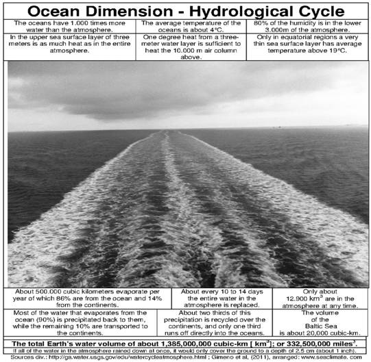 And what is the role of the sun? Her impact is immense. The earthly system would not work without the sun. Any change of solar activity is reflected in the air temperatures, not necessarily synonym, but always traceable with a moderate margin, presumably never big enough to initiate a climatic shift over many millions of years. The Earth's weather/climate system consists of the atmosphere, hydrosphere, biosphere and geosphere (UNFCCC, Art.1, par.3), influenced by conditions within the water volume and processed in each sphere. The medium that sustains and controls the atmospheric temperatures are the oceans and seas. They determine the region, timing and magnitude of water vapor and temperature variability. The sun is the fuel of the climatic system, but the driver is the ocean, and, with an average temperature of merely 4° Celsius, the major source of serious climate changes[1]. Oceans make climate!