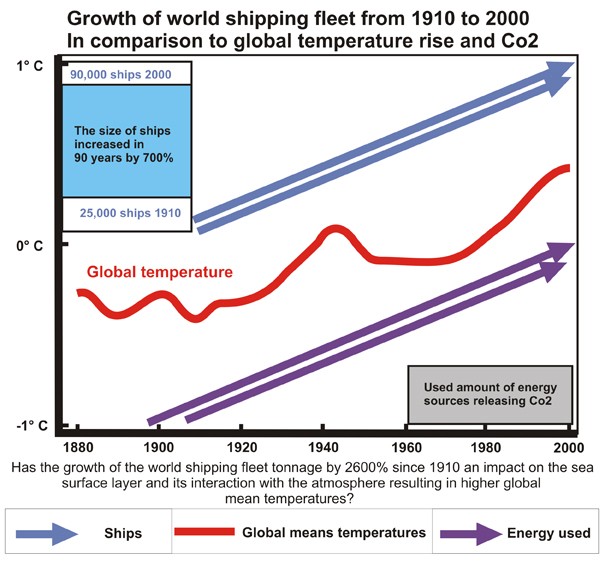 Since the mid-19th Century, people began to use the oceans in a much more intensive way. Shipping and fishing abandoned sails, but navigated instead with motor engines and ship propellers. Correspondingly, over the last 150 years the Earth has warmed by about 0.7°C, with only two climatic shifts during the entire period. 90 years ago a 20-year warming cycle began, and then the earth cooled since the first war winter 1939/40 for about three decades. Both periods stand in close correlation with the two World Wars. Have human activities in the marine environment anything to do with the change in regional and global temperature, without ever being noticed or investigated?